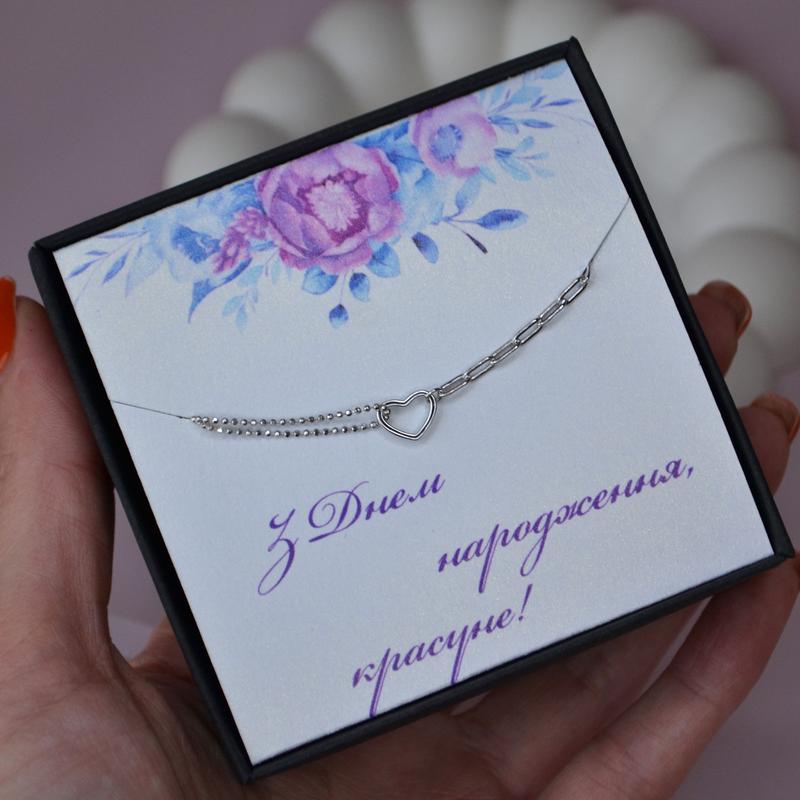 Трендовий подарунок для любителів мінімалізму. Стильне кольє із сердечком та листівка для дівчини. Ідеальне привітання для коханої з днем народження. В комплекті прикраса, листівка та подарункове упакування та інструкція по догляду за прикрасою. Такий подарунок буде єдиний та унікальний, адже це ручна робота. Відправлення здійснюється кожен день транспортною компанією Нова пошта. Також, за бажанням, Ви можете відправити подарунок анонімно. Доступна оплата при отриманні та на карту. Виконуємо персоналізований текст на листівці. Для цього надішліть Ваш текст і ми підготуємо дизайн майбутньої листівки. Термін виконання індивідуального замовлення 1-2 дні. Текст розміщується на листівці 8*8 см. Вартість персоналізованого дизайну +50 грн до суми замовлення.