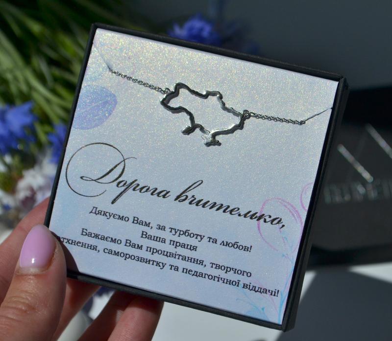 Патріотичне кольє у формі мапи України. Чудовий подарунок на випусний Як чудова ідея! Патріотичне кольє може бути прекрасним подарунком для вчителя на випускний. Воно виразить вашу вдячність та повагу до вашого вчителя, а також підкреслить національний дух. Обов'язково оберіть яскраве та стильне кольє, яке сподобається вашому вчителю. Вона обов'язково буде вражениа вашою увагою та турботою! Жіноче кольє довжиною 45 см, тонкий ланцжок. Родоване покриття, 925 проба. Виконуємо персоналізований текст на листівці. Для цього надішліть Ваш текст і ми підготуємо дизайн майбутньої листівки. Термін виконання індивідуального замовлення 1-2 дні. Текст розміщується на листівці 8*8 см. Вартість персоналізованого дизайну +50 грн до суми замовлення.