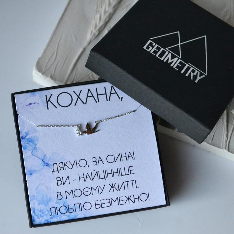 Що подарувати найдорожчій дружині за народження сина? Підвіска у формі голубки стане чудовим та символічним подарунком для Вашої коханої. Характеристики • ювелірний сплав металів та родоване покриття 925 проби • ланцюжок 45 см. • індивідуальні листівка із перламутрового картону • подарункова коробка із високоякісного картону чорного кольору, розмір 8*8*3 см Виконуємо персоналізований текст на листівці. Для цього надішліть Ваш текст і ми підготуємо дизайн майбутньої листівки. Термін виконання індивідуального замовлення 1-2 дні. Текст розміщується на листівці 8*8 см. Вартість персоналізованого дизайну +50 грн до суми замовлення.