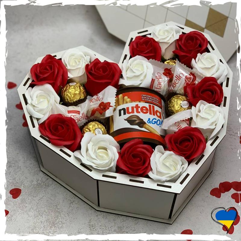 Подарочный бокс от которого она точно будет в восторге😍 В состав входит: ✨мыльные розы ✨шоколадная паста nutella с палочками ✨конфеты Fererro Rocher ✨конфеты Raffaello