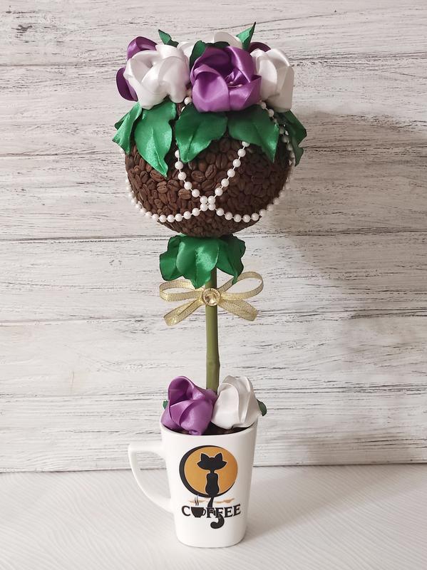 Сувенир статуэтка топиарий (дерево счастья) с кофе и атласными лентами ручная работа хенд...