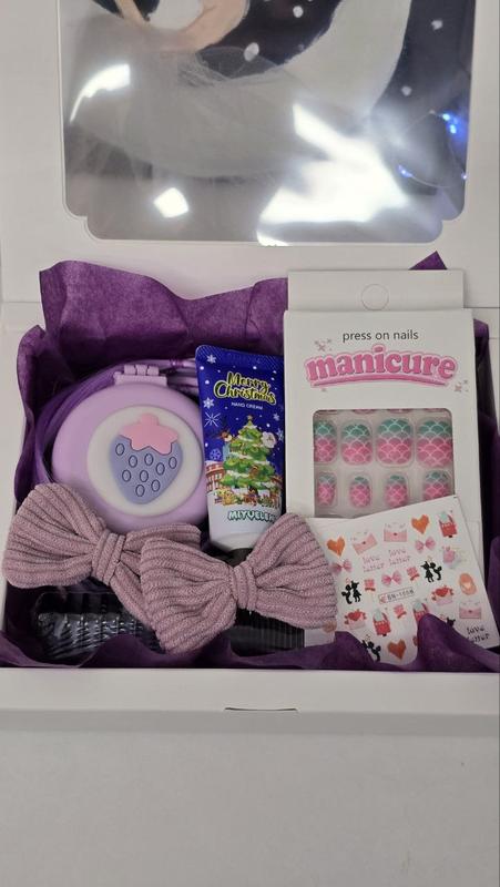 В набор входит: - зеркальце с расческой - накладные ногти с двумя наклейками - наклейки для ногтей - 2 резинки бантики - крем для рук - резинка косички - расческа с фиолетовой краской