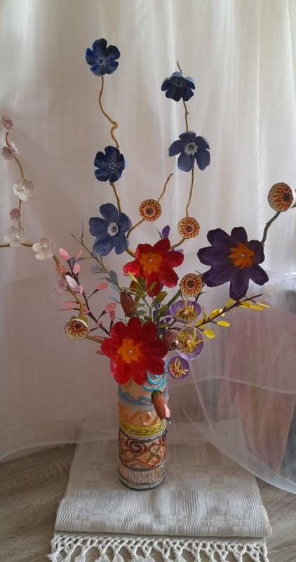Композиция из цветов и ваза выполнены в технике - папье маше, в одном экземпляре. Яркий положительный декор для любого помещения (дом, офис, салон, магазин...) Размер - высота 90см.