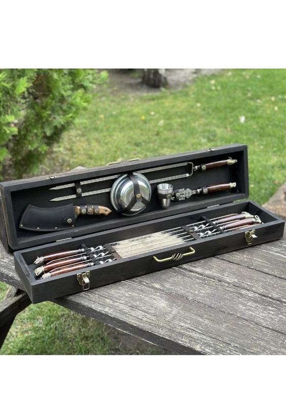 Набор шампуров в деревянном кейсе премиум класса Сделайте свои пикники идеальными с элегантным набором шампуров в стильном деревянном кейсе, созданном для настоящих ценителей комфорта и эстетики. Что делает этот набор особенным? Кейс: изготовлен из натуральной сосны, покрыт морилкой для сохранения текстуры дерева и обработан эффектом браширования, что придает ему стильный вид. Шампуры: 6 шампуров с дубовыми ручками, украшенными деталями из бронзы в виде голов зверей и цевками, создают атмосферу роскоши. Двойной шампур: специально разработан для приготовления крылышек и овощей, расширяет кулинарные возможности. Кухонный топор: практичный инструмент для подготовки дров или обработки продуктов. Вилка для снятия мяса из шампура: универсальный инструмент с бронзовым украшением в виде головы животного. Сервировки: набор из 6 мисок, 6 рюмок, дополнят сервировку и сделают ваш отдых максимально комфортным. Зачем выбирать этот набор? Это не просто аксессуары – это стильный и функциональный набор, который станет идеальным подарком для любителей пикников, охотников, рыбаков или тех, кто ценит качественные вещи. Преимущества: Высокое качество исполнения и премиум-материала. Уникальный дизайн с элементами ручной работы. Возможность персонализации — лазерная гравировка на кейсе, ножах, шампурах или рюмках. Заказывайте сейчас и добавьте элегантности вашему отдыху! Характеристика: ▫️Коробка из натурального дерева - 870×200×135 мм. с эффектом орошения ▪️6 шампуров с деревянной ручкой (ясен). Общая длина шампура - 74 см. Рабочая длина - 50 см. Ширина - 12 мм. Товщина - 3 мм. Художественное литье - бронза с чернением. ▫️Вилка для снятия мяса ▪️Двойной шампур для птицы 50 см. рабочая длина ▫️Топор для мяса из стали 65Г ▪️6 тарелок из нержавеющей стали ▫️6 рюмок из нержавеющей стали ▪️Ремешки для крепления - кожа. ▫️Веерник для угля