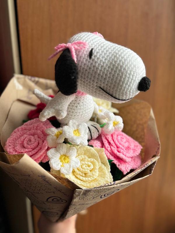 Необычный букет, который удивит. Выглядит шикарно. Вязаные цветы, 5 роз и две белые веточки+ игрушка мульт герой Снуппи. По вашему желанию, можем изменить цвета, количество и цвет цветов, игрушку.