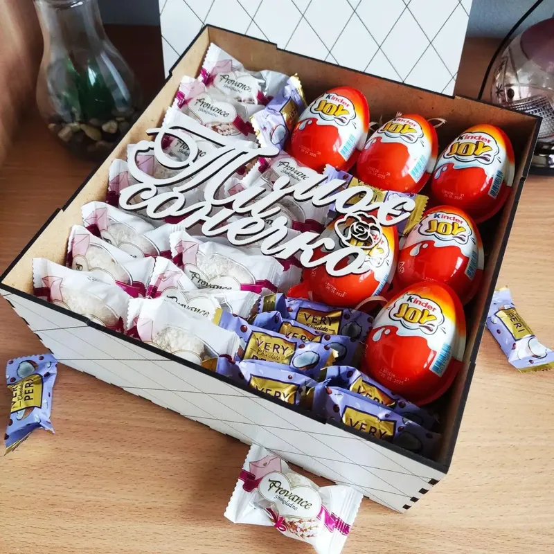 Скажите «Да» очарованию и нежности с нашими подарочными наборами, наполненными сладкими удовольствиями, которые точно покорят сердца ваших близких!  День влюбленных, 8 Марта, День рождения, Новый год, И многие другие особенные моменты в жизни! В состав входит: - Конфеты VERY PERI 8 шт - Конфеты Provance с кремовой начинкой в кокосовой стружке 14 шт - Kinder JOY 6 шт  - Топер на выбор - Наполнитель - стружка  🎁 Размер коробочки 24*24*10 см Наши подарки - лучший способ выразить свои чувства