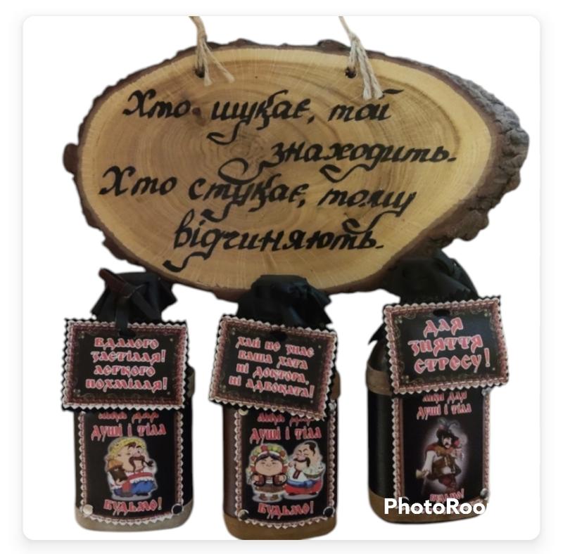 Набор 3 декоративные бутылки и табличка с неординарными пожеланиями. Декоративная деревянная табличка шутливыми выполнена из древесины. Она может стать удивительным подарком для друзей. Подарок из дерева считается издавна символом благополучия и долголетия. Объем декоративной бутылки 0.2 литра. Стеклянная бутылка обтянута кожей. К бутылке прилагается "рецепт" с рекомендациями к использованию. Ручная работа. Компактная стеклянная бутылка, декорированная кожей с чудесной крышечкой на завязочках, придется по душе каждому украинцу. В ней удобно переносить с собой алкоголь, ведь кожа защищает бутылку от повреждения. Также она отлично подойдет для хранения разнообразных спиртовых настоев и настоек, например, лекарственных. Она будет красиво смотреться на тумбочке у кровати. И вы не забудете о том, что пора выпить лекарства, или осуществить растирания