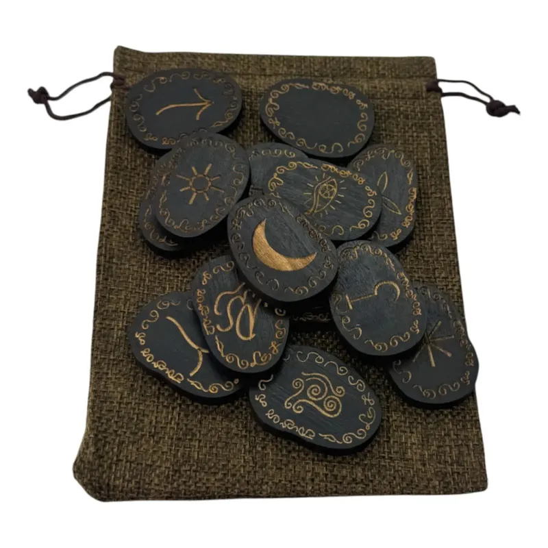 Руны "ведьмины" (викканские) темные, 14 рун (4,2*3,1*0,7 см) с мешочком , массив дерева