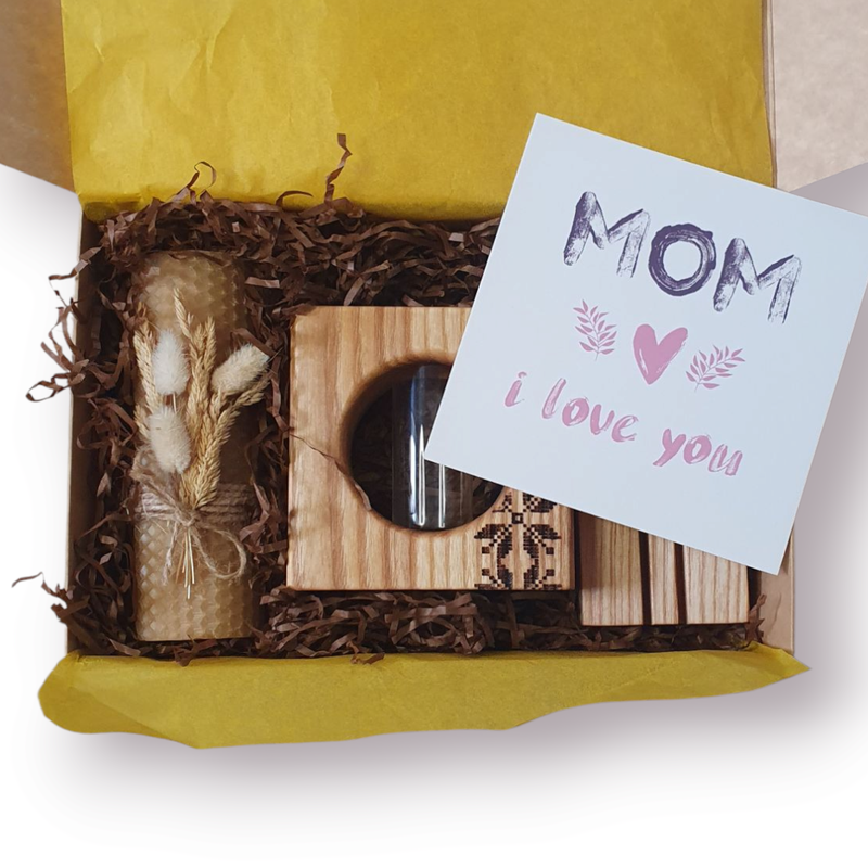 Подарочный набор ко дню матери, деревянная ваза, вощеная свеча, подставка для фото