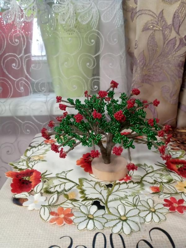 дерево из бисера с гибкими ветвями на деревянной подставке высотой 15см