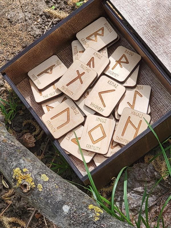 Руночный Набор с гравировкой. 24 руна Старого Футарка + руна Одина. Ручная работа. Натуральное дерево. Размер одной руны 3 на 3,8 см. Размер набора 15 на 14 см. Высота 6см. Руны - это графические символы, и каждый из них имеет свою собственную длину волны. Их энергия сама по себе нейтральна и не привязана ни к какому источнику – только к своей форме. Это означает, что для использования магии рун достаточно запомнить, как они выглядят и что означают. Руночный набор Spirit Box пригодится вам для изучения скандинавских рун. В комплекте вы получите буклет с ключевыми понятиями старшего Футарка. Супер тактильные, сделанные вручную из натурального дерева, они станут настоящими помощниками и проводниками в открытии ваших скрытых способностей.