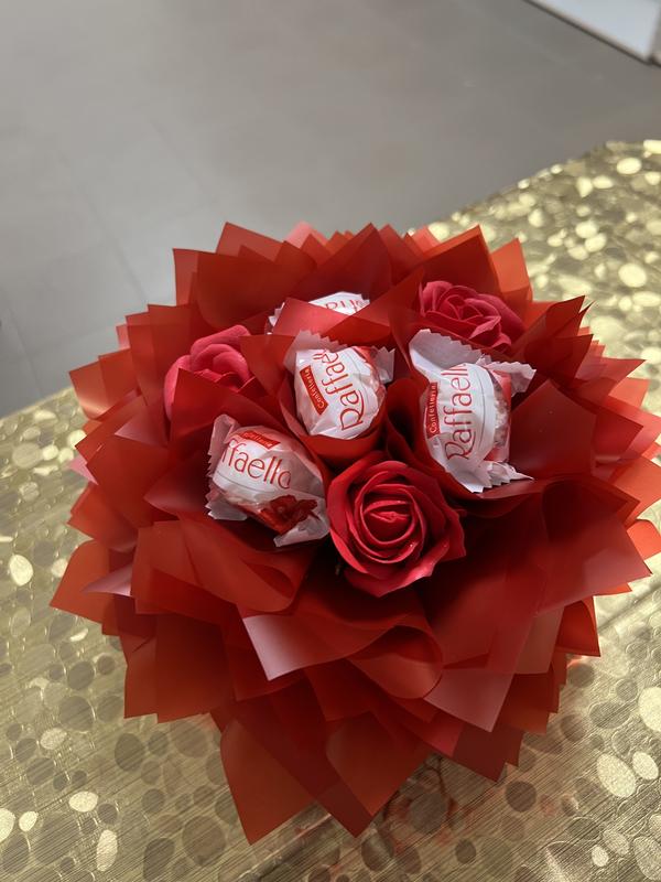 Міні композиція, з мильними 🌹 та цукерками Рафаело дуже пишна та ефектна 😍 , може бути подарунком на іменини або просто несподіваним сюрпризом 🤗 відправляю композиції поштою