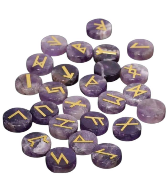 Руны -- самые древние буквы, которые помогают людям общаться сгнивами. На сегодняшний день это самые мощные амулеты, которые имеют с собой разные амулеты. Также это мощный инструмент для того, чтобы разобраться в себе и получить ответы на волнующие Вас вопросы. Аметист - камень гармонии и миролюбия, помогает избегать скандалов,лоттю, определяет злобные замыслы, находить общий язык с людьми. Также аметист способен в развитии творческого потенциала. Набор из 25 рун из аметиста Размер руна от 1,6 до 1,8 см