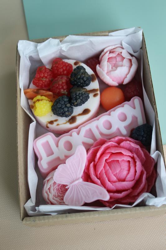 Интересные подарочные наборы сувенирного мыла для приветствия врачей с профессиональным праздником, или чтобы выразить им восхищение за труд Цветы, надпись, вкусное пирожное, ягоды - все из милой ручной работы. В наличии и по заказу требуется количество наборов Размер крафтовой коробочки 16*11*4.5 см