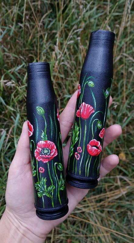 В Наявності гільза з маками та що на першому фото, покрита художнім лаком, намалюю під замовлення з вашими картинками Ціна на гільзу з маками 14,5мм 690грн