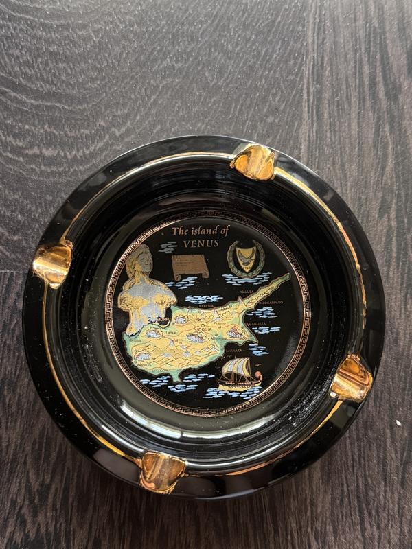 Елегантний сувенірний набір із зображенням карти Кіпру «The Island of Venus». Виготовлений вручну, декорований позолотою 24K. Складається з попільнички та підставки під запальничку (може також використовуватись як декоративна міні-ваза). Стильний чорний фон із золотими та кольоровими деталями робить набір яскравим акцентом у будь-якому інтер’єрі. Стан ідеальний, без пошкоджень. Колекційний варіант або стильний подарунок для поціновувачів унікальних речей.