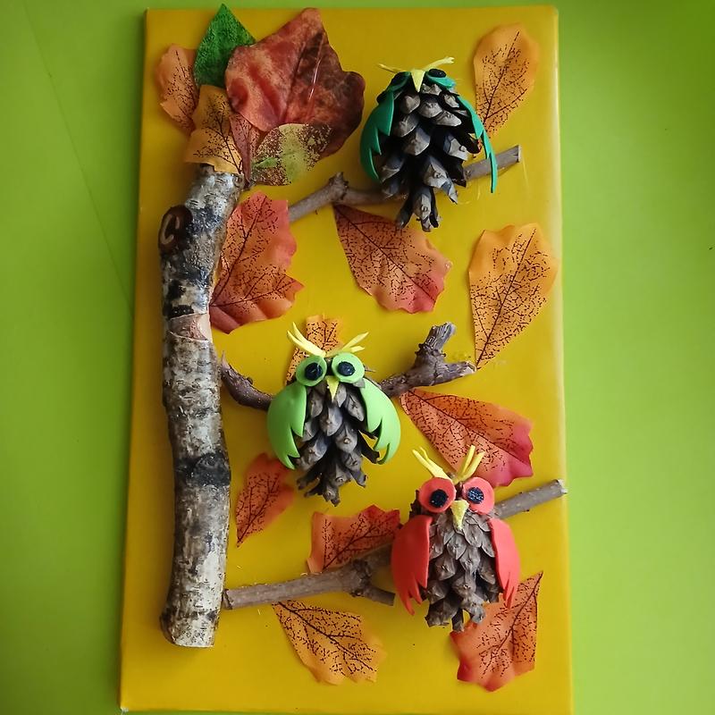 осенняя композиция, осенний декор, подарок, поработка из природных материалов, ручная работа, изделие на толстом картоне, осенняя тематика три совушки на дереве размер