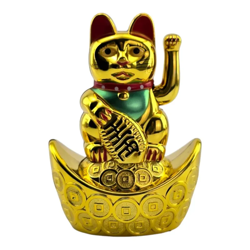 Работает от одной батарейки AAA (в комплект не входит). Классический японский талисман Манеки-неко - «кошечка, призывающая успех и деньги». Фигурка стоит на золотом челноке с монетами, в лапе держит овальную монету-кобан с буквами достатка. Приподнятая правая лапка ритмично машет, привлекая клиентов и финансовый успех. Ставят у входа, на кассе или ресепшене магазина, в кафе и салонах, в кабинете и дома на полке или рабочем столе. Характеристики: Питание: 1 батарейка AAA (!не входит в комплект!) Размеры: высота 9,7 см, ширина 7 см, глубина 4,8 см Цвет: золотистый Тип: настольная фигурка-талисман с двигающейся лапкой. Назначение: для офиса и дома, на кассу/ветрину, подарок на удачу и изобилие