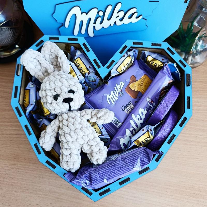 Оригинальный подарочный набор, который станет отличным подарком для ребенка или любимой девушки. Симпатичный бокс, от которого ребенок или любимая обязательно будут в восторге. Наполнение, которое точно понравится и станет вариантом оригинального подарка. В состав входит: - Коробка - Мягкая игрушка ручной работы - Шоколадка VERY PERI 1 шт - Цукерки VERY PERI 11 шт - Печиво Milka 1 шт - Шоколадка Milka Oreo 1 шт - Вафля Milka choco кругла 2 шт - Бисквит Milka 1 шт - Наполнитель - стружка 🎁 Размер коробочки: 20х18х7 см Наши подарки - лучший способ выразить свои чувства