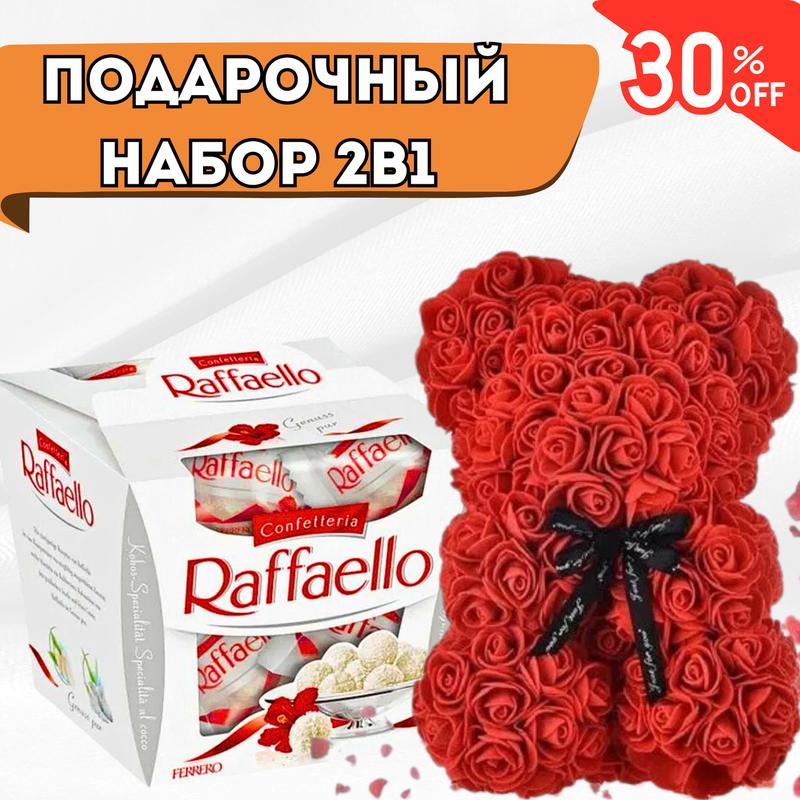 # # # # # # # Идеальный подарочный набор для женщин на 14 февраля Мишка 25см + Raffaello конфеты Красный Описание: "Красная Нежность: Подарочный набор Мишка из Роз и Rafaello'" Освежите радость подарка и создайте волшебный момент с нашим уникальным подарочным набором. В этом нежном комплекте сочетаются роскошный мишка из искусственных роз и изысканные шоколадные конфеты Rafaello. Особенности Набора: Мишка из Роз: Этот милый медвежонок, не только служит трогательны другом, но и становится неповторимым элементом декора. Rafaello - Эксклюзивный Вкус: Конфеты Rafaello представляют из себя великолепное сочетание кокоса, миндаля и хрустящего вкуса, создавая неповторимый кулинарный опыт. ### Особенности: Почему Этот Набор Особенный: Эстетика и Долговечность Роз: Мишка из роз и сохранит свою элегантность, принося радость и восхищение. Экстравагантность и Роскошь Вкуса: Rafaello - это изысканный десерт, который поражает своим вкусом и создает атмосферу настоящего праздника. Подходит для Любого События: Любовь и Романтика: Идеальный подарок для выражения ваших чувств и создания романтической атмосферы. Праздники и Особые Моменты: Подчеркните значимые моменты, такие как День Рождения, Годовщина или Новый Год. Символ Внимания и Ласки: Подарите этот комплект как знак внимания и гармонии в отношениях. Характеристики Назначение: игрушка + Рафаело Размер: 25 см Цвет: красный