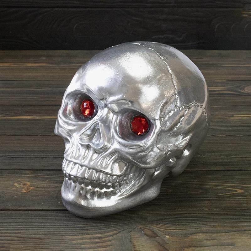 Череп копилка Мистик M 13789 (серебряный) - необычная копилка в форме черепа, оригинальный подарок на Хэллоуин. Особенно необычно и эффектно в копилке смотрятся естественные швы на стыке костей черепной коробки и белоснежные зубы. Череп полый внутри, так как это копилка. В верхней части на затылке имеется отверстие для монет. Прямые поставки оригинальных копилок для Вашего магазина по лучшим ценам от интернет магазина Карнавал Приколов.