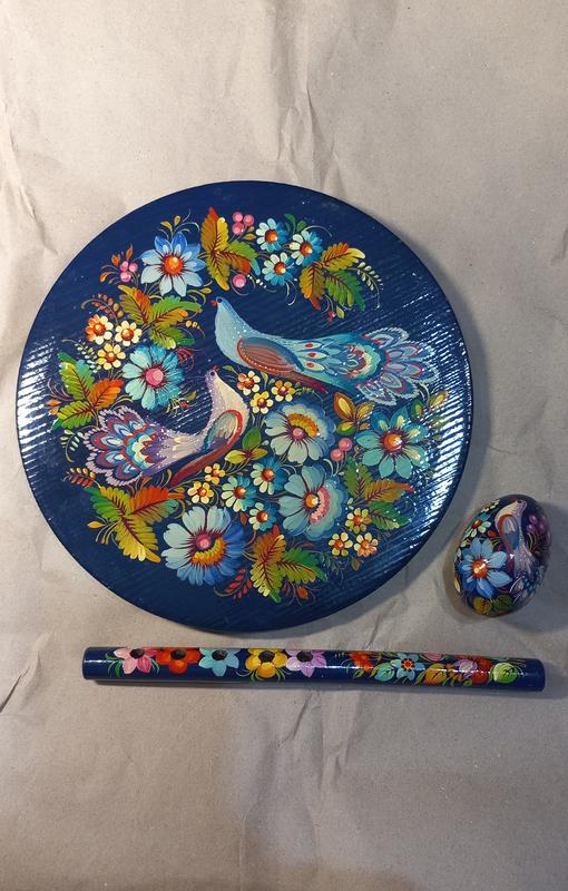 Внешний вид, состояние, авторская подпись и детали росписи изображены на фото. Цена набора из трех предметов 2900 грн Оригинальная декоративная сувенирная продукция, приобретенная в Центре народного искусства "Петрик" (смт. Петриковка Днепропетровской области) в 2000х годах. Ручная работа мастеров. Материал - дерево, покрытое краской и расписанное вручную. Набор декоративных изделий: - Тарелка синего цвета с растительным орнаментом и изображением птиц. Художник К. Тимошенко Диаметр тарелки 24 см; - Писанка: яйцо синего цвета с образной к тарелки орнаментом Художник К. Тимошенко Длина яйца 6,5 см; - Сопелка синего цвета с цветочным орнаментом Художник В. Шевченко Длина свирептуры 23 см. Набор станет отличным дополнением к Вашей коллекции!