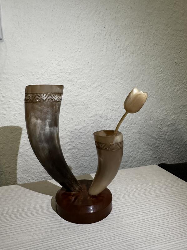 Унікальна декоративна композиція. Два натуральні роги закріплені на підставці, створюючи ефектний інтер'єрний акцент. Роги прикрашені етнічним різьбленим орнаментом по верхньому краю і демонструють природний, неповторний колірний градієнт. Це суто декоративний виріб (не для напоїв), ідеальний як стильна ваза для сухих квітів або як самодостатній елемент декору. Чудовий подарунок для поціновувачів автентичного та етно-стилю. Розмір 16*12 см. Стан ідеальний.
