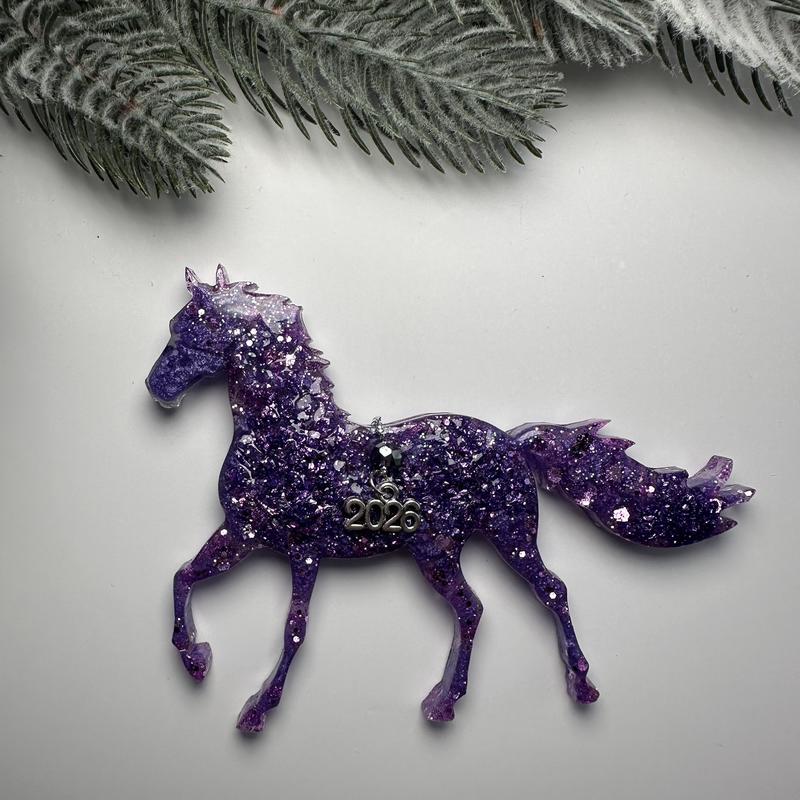 Handmade В работе использованы материалы: эпоксидная смола, сияющие блестки, лента парчевая, неодимовый магнит, декоративная подвеска. Размер: высота 9 см, ширина 12 см. Символ Нового года 2026 *Огненный конь*.
