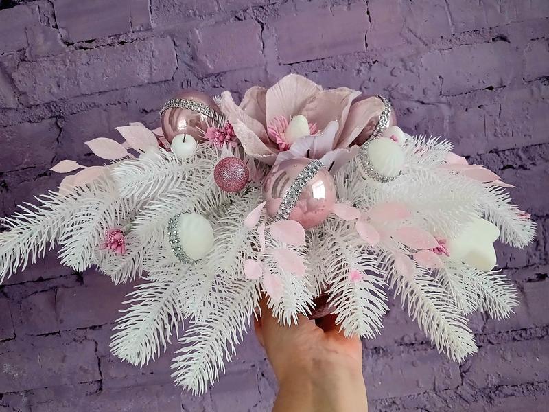 невероятно красивая Интер"ера композиция в бело розовых тонах. композиция размещена в красивом металлическом кашпо, что очень гармонично сочетается с нежными цветами декора. используется белую пушистую литую хвою, бархатистую магнолию, разнообразные шарики и шарики приложения. эта красавица обязательно добавит праздничности Интер"у и будет радовать вас весь зимний период. высота композиции 20см., ширина 60см., глубина 30см. ручная работа. в одиночном экземпляре.