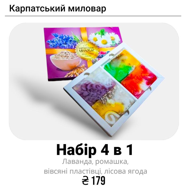 Мыло с лавандой, мыло из ромашки, натуральное мыло с овсяными хлопьями, мыло - лесная ягода. Это отличный подарок для Вас и Ваших близких. Подарочный набор натурального мыла 4в1 от крафтового производителя Карпатский мыловар.