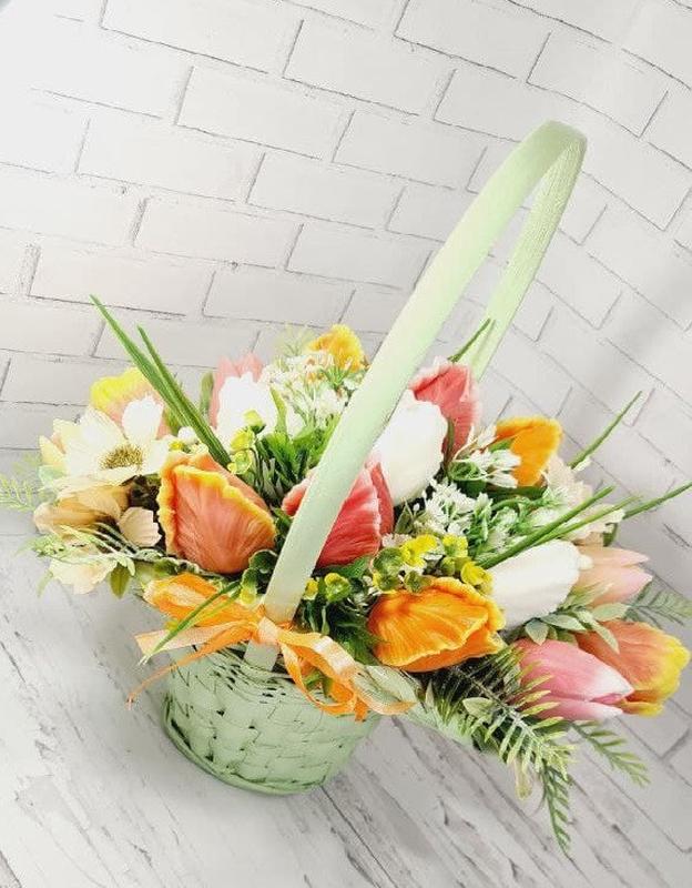 Яркая и ароматная композиция из мыльных тюльпанов в оливковой корзине . Такой букет цветов подойдет на любой праздник , так же хорошо будет смотреть в интерьере , а аромат будет стоять дольше чем у обычных цветов ! Цветовая гамма может быть разной . Букеты и цветы в корзинах делаю под заказ ❗️ Наличия корзин , уточнять ! Декор осуществляется из наличия и может отличаться от фото. Сроки изготовления от 2-4 дней и зависят от объёма, однотипности и сложности заказа. Заказ нужно бронировать за 3/4 дня ! До вашего мероприятия и учитывайте сроки доставки 2/3 дня, если Новой почтой, Укр. Почта дольше. Выполнение заказа осуществляется только после 50% предоплаты. ⠀