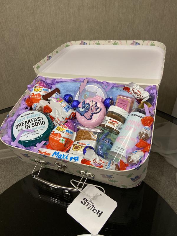 Подарунковий бокс Stitch - солодощі та догляд у стильному чемоданчику Яскравий та креативний подарунок для тих, хто любить мультяшний шарм та приємні сюрпризи! У стильному чемоданчику з принтом Disney Stitch зібрано найсмачніші ласощі та якісну доглядову косметику, щоб подарувати море емоцій і хороший настрій. У складі: - Kinder Joy, 2 шт - Kinder Maxi, 1 шт - Kinder Bueno mini, 3 шт - Kinder Cards, 1 шт - Kinder Happy Hippo, 1 шт - Nutella mini, 24г - Kinder choco bons, 4 шт - Молочний шоколад зі смаком капучино Fondre Loran, 1 шт - Гель для душу Jellys Tiffany, 300 мл - Парфумований міст для тіла Pink Sky від Mr.Scrubber, 150 мл - Мʼяка косметичка із зображенням Stitch, Disney - Складне дзеркало гребінець зі Stitch - Подарунковий чемоданчик Disney Stitch Коробка-чемоданчик багаторазового використання -- можна зберігати аксесуари, косметику чи інші дрібнички. Ідеально підходить як подарунок на День народження, Новий рік, 14 лютого, 8 Березня або просто для того, щоб підняти настрій близькій людині. Stitch завжди поруч, щоб дарувати посмішки!
