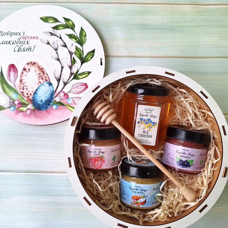 Подарочный набор №119 Подарочный набор к празднику Пасха в круглой деревянной коробочке размером 21*21*9 см, Коробочка завязана веревкой. С надписью на крышке "Добрых и светлых Пасхальных праздников". В наборе: - 250 г мед майский, - 130 г крем-мед смородина, - 130 г крем-мед кокос-миндаль, - 130 г крем-мед клубника, - медовая ложка. Такой подарок прекрасно подойдет для друзей и знакомых во время празднования светлой Пасхи. Наполнением подарочного набора стала натуральная продукция украинского производителя, семейной пасеки Царство Меда. Размер 21*21*8 см