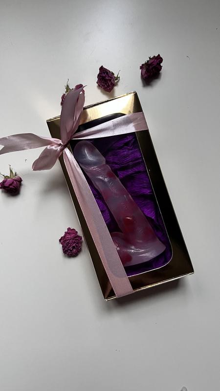 Мыло ручной работы "Пенис" Оригинальное мыло ручной работы в форме пениса станет ярким подарком для смелых людей с чувством юмора. Изготовлено из высококачественной мыльной основы, безопасной для кожи, с нежным ароматом, который добавит игривости вашему уходу за телом. Это мыло идеально подойдёт как аксессуар для тематических вечеринок, подарок на девичник или забавный сюрприз для близкого человека. Характеристики: - ### Материал: мыльная основа, глицерин - ### Размер:16 см - ### Вес: 220 гр. - ### Цвет: прозрачное с красными блёстками - ### Упаковка: элегантная коробка с декоративным наполнителем Уход: Хранить в сухом месте после использования. Примечание: Изделие создано с юмором, не является предметом для реального использования по назначению. Удивите своих друзей или подарите себе что-то необычное!