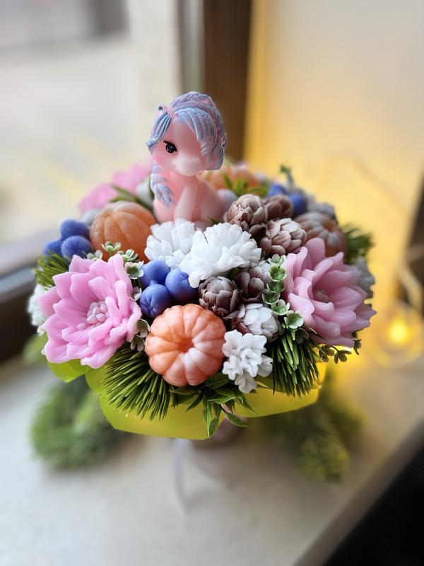 🎄 Лимитированный новогодний мыльный букет с фигуркой пони ручной работы 🦄✨ Нежная праздничная композиция из ароматного мыла, украшена яркими цветами, шишками, тыквинками и вечнозелеными веточками. По центру - милая фигурка пони, также выполнена вручную. Такой букет станет волшебным подарком для детей и взрослых! 🌿 Особенности: - 100% ручная работа - Ароматное мыло, безопасное для кожи - Уникальный дизайн с фигуркой пони - Не увядает и не требует ухода - Идеальный новогодний подарок или декор 🎁 Размер: около 25×17 см (+-) 🎀 Упакован в праздничную пленку, готов к подарку 💫 Коллекция ограниченакаждый букет уникален!