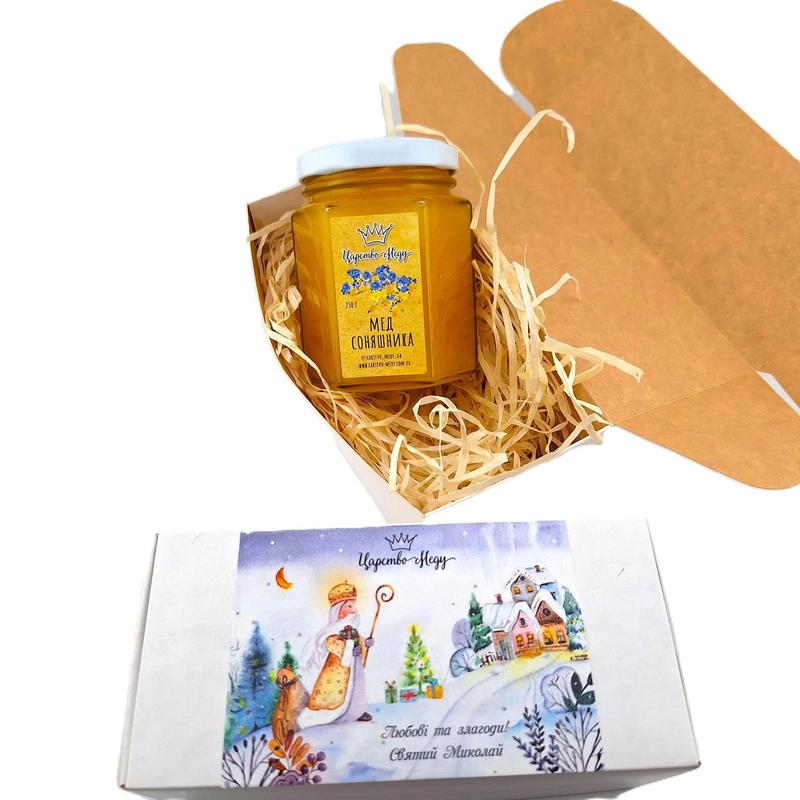 Подарок ко Дню Свяого Николая. Отличный подарок ко дню св. Николая в коробочке с праздничной наклейкой и атласной лентой. В наборе: - 250 г соняшникового меду Наполнением такого подарочного бокса к Дню Св. Николая является продукция украинского бренда семейной пасеки и имеет натуральную составную. Размер 15*7*6 cм