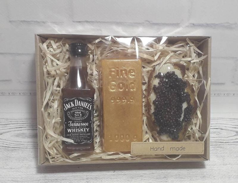 Подарочный набор сувенирного мыла виски, слиток золота и бутерброд с икрой мыло ручной раб...