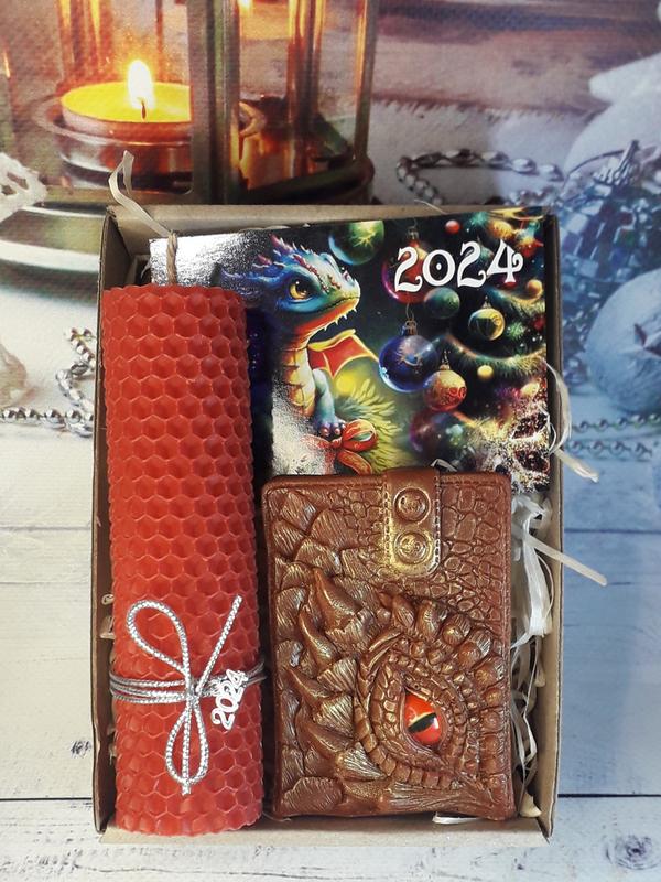 Новогодний подарочный набор: -свеча из цветной вощины -мыло ручной работы Портмоне-дракон Вощина - натуральный, экологически чистый продукт. При горении воск выделяет антимикробные ферменты, лечебные эфироносы - воздух в доме очищается.Такие свечи горят ровно, без чада и неприятного запаха, не оплывают и не коптят. При сгорании свеча выделяет приятный медовый аромат, который снимает стресс, а также обладает природными полезными свойствами. Размер коробочки 11,5*16*4,5см Размер свечи 13*3,5см. Время горения одной свечи 4 часа. Размер мыла 9*6,4*2см, вес 80г. Размер коробки 10*8см Мыло изготовлено из профессиональной основы с добавлением масла сладкого миндаля и авокадо. Ароматы цитрусовые. !!!В мыло вплавлен глаз из стекла Цвет уточняйте при заказе. Цвет может отличаться от цвета на фото Срок отправки 2-3 дня