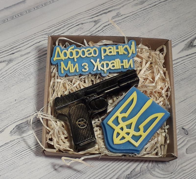 Подарунковий набір сувенірного мила пістолет і доброї ранки! ми з україни, герб мило ручно...