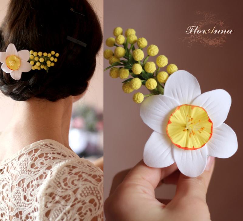 Хотите сделать оригинальный подарок девушке? Украшение ручной работы - идеальный подарок дорогому человеку. Наши цветы с всегда дарят много радости и душевной теплоты. Композиция состоит из нарцисса и веточки мимозы Основа заколка крокодильчик, хорошо держится в волосах. Каждый цветочек слеплен вручную из очень легкой японской самоотвердевающей полимерной глины decoclay. Наши цветы слеплены с любовью и очень схожи с живыми цветами. Возможен комплект(см. Комплекты украшений) -серьги - браслет -колечко