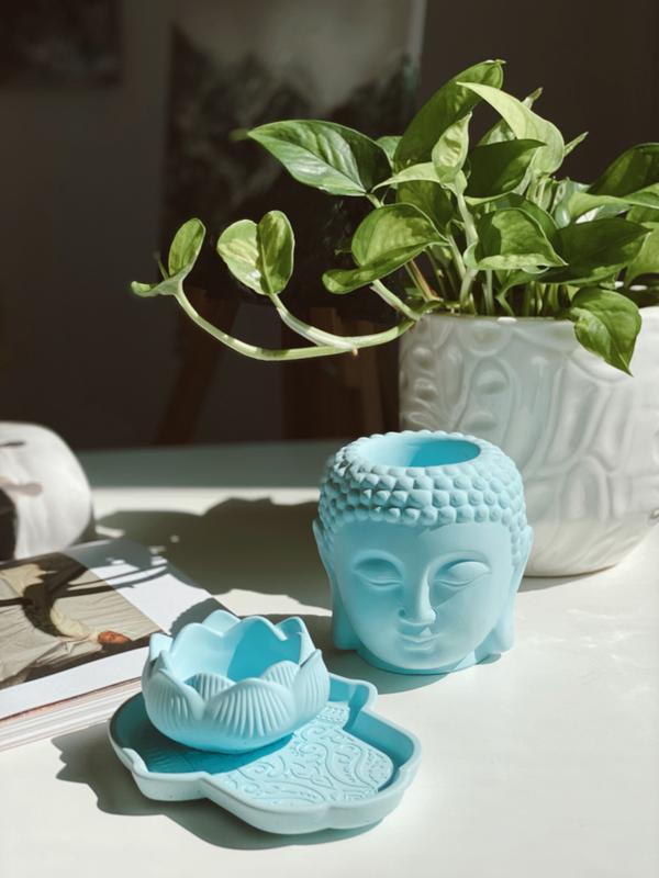 Набор для медитации будда из гипса ручной работы с подставками для благовоний голубой