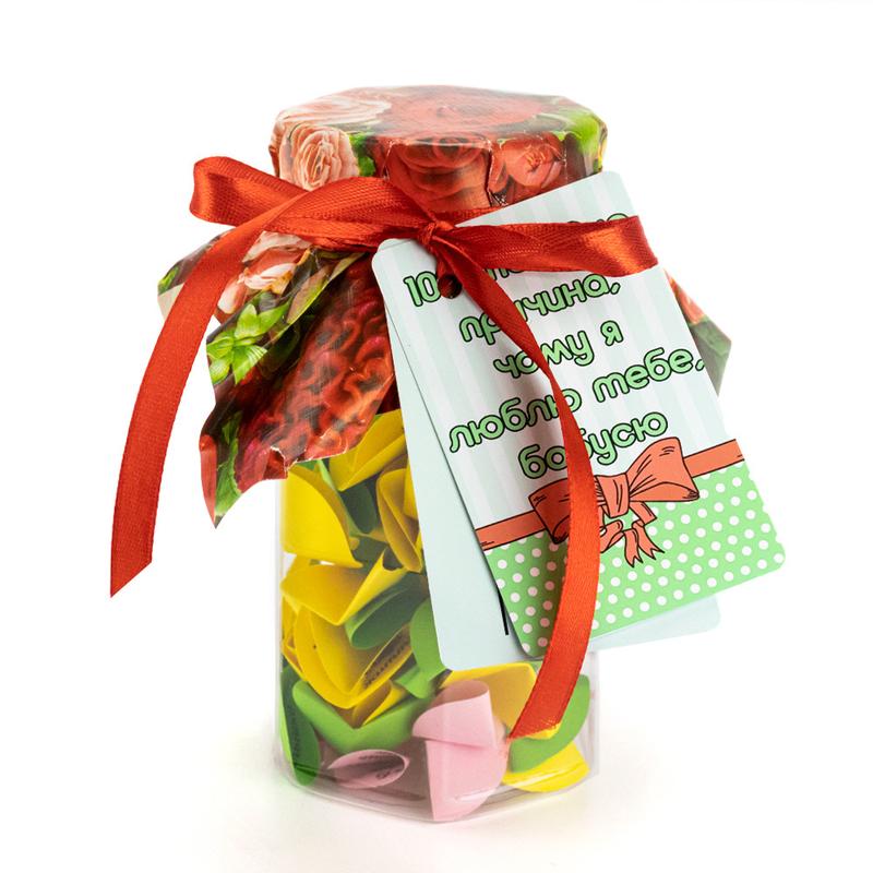 100 и Одна Причина, почему я люблю тебя, бабушка (укр. ) — тщательно отобран нашими специалистами по ярким эмоциям. Баночка поможет Вам ежедневно радовать близкого Вам человека теплыми словами любви. Такой изумительный сюрприз можно подарить на день рождения либо преподнести на юбилей, или просто на 8 марта. Разворачивая фантики, произносите Ты желаешь мне счастья, Подарок выполнен на украинском языке. Ты умеешь интересно шутить, У тебя золотое сердце… Разумеется, Вы можете постараться сделать такую банку своими руками, но это заберет у Вас невероятно много времени. Чтобы Вы не сидели несколько часов, вырезая фантики и придумывая, что же написать, мы сделали все за вас. Вы можете купить уже готовую увлекательную игру в подарок родным и близким, друзьям и знакомым. Интернет магазин Карнавал Приколов предлагает купить оптом интересные и оригинальные подарки по низким ценам, а также Вы можете оформить заказ на сайте и задать любые интересующие вопросы менеджеру, заказав звонок на нашем сайте.