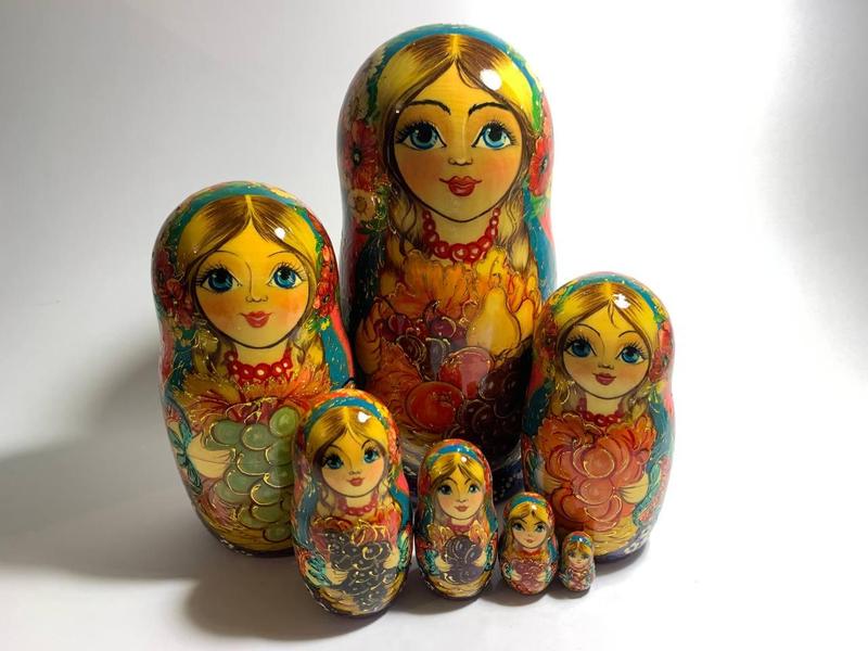 1-я Матрешка: Высота-20,5 см Диаметр-9 см В наличии есть разные матрешки и разных размеров, с различной росписью. Эксклюзивная матрешка, полностью ручная роспись, ручная работа. Деревянная матрешка - это очень популярный, стильный подарок. Их как сувенир, в первую очередь, привозят и дарят иностранным родственникам, друзьям или коллегам. Играя с матрешкой, разбирая и собирая ее, ребенок может научиться считать, сравнивать и различать предметы.