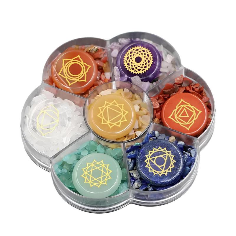 Этот набор RESTEQ включает в себя 7 полудрагоценных камней соответствующих 7 чакрам человека. Чакральная психоэнергетическая система представляет собой 7 чакр вашего тела с 7 различными центрами энергии. Каждая чакра связана с одной областью тела и эмоциональным состоянием. Считается, что балансировка этих энергий принесет пользу вашему эмоциональному, физическому и духовному благополучию. Камни, в свою очередь, используются для балансировки чакр, они заряжают положительной и целительной энергией, одновременно удаляя отрицательную энергетику. Считается, что использование кристаллов помогает вызвать умиротворение, расслабление. В набор входят 7 полудрагоценных кристаллов: горный хрусталь, аметист, лазурит, зеленый авантюрин, желтый нефрит, красный агат, огненная яшма. - Круглые камни размером около 25*25*5 мм - Маленькие камни размером 3 ~ 6 мм (без отверстия) - Размер коробки: 118*104*30 мм - Вес (прибл.): 150 г Артикул: VA-1430293744