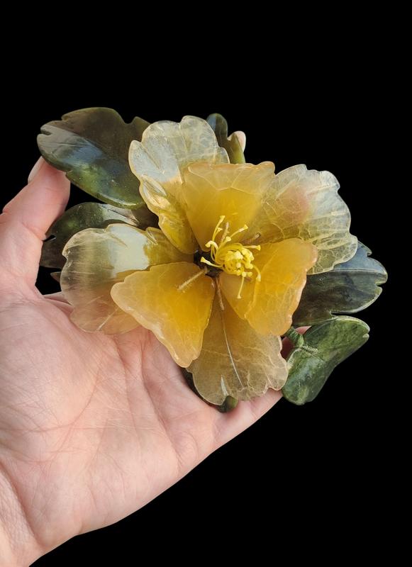 Пропонуємо до Вашої уваги квітку з натурального нефриту та оніксу. Вага: 146.70 гр. Розмір (загальний): 14,5*10 см. Розмір деталей: 38*46 мм., 49*40 мм.