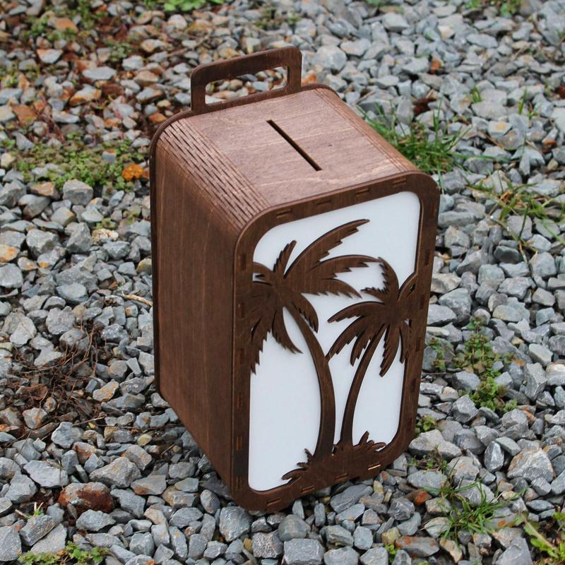 Дерев'яна скарбничка-валіза для грошей Дерев'яна скарбничка - гарний подарунок друзям та близьким, корисний аксесуар для себе. Вона призначена для накопичень, а також виконує декоративну функцію.