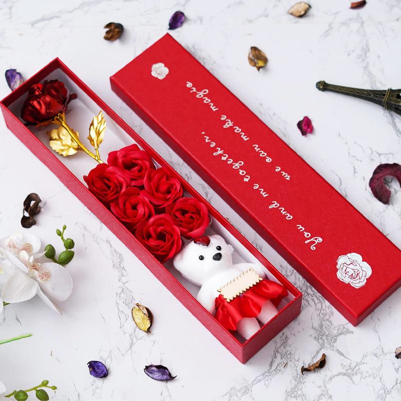 Подарок девушке станет настоящим приятным сюрпризом и точно удивит. Такой букет идеален для подарка на день Святого Валентина, 8 марта, день рождения и просто как подарок без повода Преимущества: - Приятный запах мыла - Подходят для любого возраста и случая - Красивая подарочная упаковка - Мыло из натуральных ингредиентов - Мыльные розы сохраняют свою красоту долго - Уникальный подарок: сочетание мыльных роз и плюшевого мишки. Описание: Удивительный подарок на 14 февраля сочетает в себе нежность и красоту роз с милым плюшевым мишкой, создавая идеальный подарок для особого человека. Коробка из мыльных роз дополняется мягким мишкой, чтобы порадовать получателя не только красотой, но и милым плюшевым другом. Подарочный набор станет идеальным подарком для различных случаев: от Дня Святого Валентина до дня рождения или просто для проявления нежных чувств. Романтичный жест в виде мишки и роз из мыла подчеркнет вашу заботу и внимание к получателю, создавая атмосферу нежности и тепла в любой момент Характеристики: - Тип: подарочный набор для женщины / подарочный бокс - Размеры мишки: 10.5 х 8 х 4 см - Размеры мыльных роз: 4.50 х 4 х 4 - Размеры фольгированной розы: 18 х 6.5 х 0.5 см - Упаковка: коробка - Цвет коробки: красный Комплектация: - Мыльные розы - 6 шт - Фольгированная роза - 1 шт - Мишка с табличкой - 1 шт - Подарочная коробка