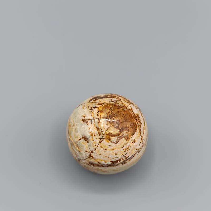 Изготовлена из мраморного оникса, минерала, который часто используется для декоративных предметов. Характеризуется кремовым, белым, желтым и коричневым полосатым узором. Присутствующие естественные трещины или прожилки (вены), придающие уникальности внешнему виду. Поверхность отполированная, что придает ей блеск диаметр 36мм