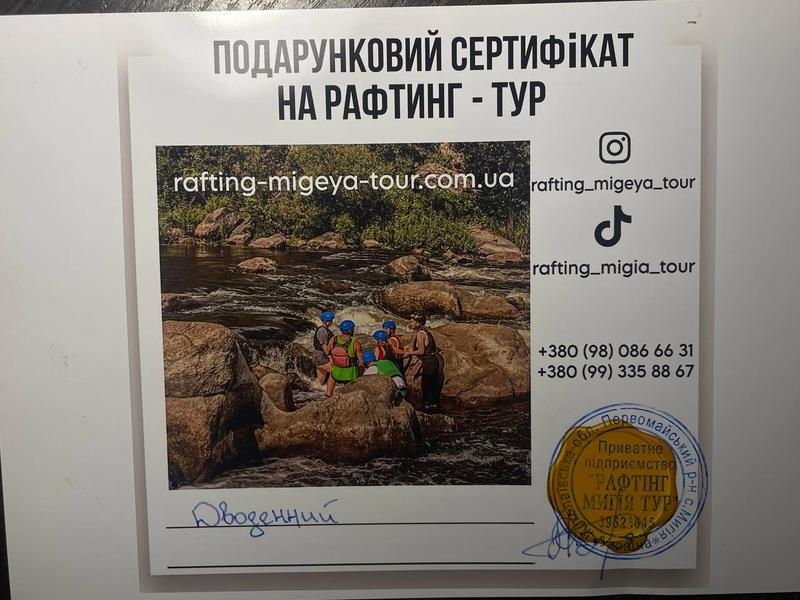 Оригінальний подарунок близьким та рідним до новорічних свят. Замовляйте подарунковий сертифікат на рафтинг-тури: одноденний тур - 1500 грн/особа дводенний тур - 2500 грн/особа триденний - 3600 грн/особа У вартість туру входить: проживання, харчування, рафтинг по порогам Південного Бугу, екскурсії та інше. Детально з програмами можна ознайомитись на нашому сайті. *********************************** (Сертифікат не має терміну дії та може бути використаний в будь якому сезоні) Телефонувати за номером +38****************