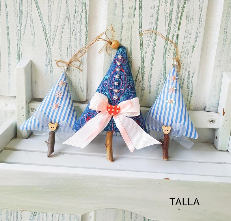 - все елки выполнены в различных дизайнерах - использованы различные виды тканей - украшены пайетками, лентами, полубусинами и кружевом - наполнитель синтепон - сверху есть петелька с бусиной - ножка сделана из веточки дерева Маленький новогодний сувенир украсит Вашу елку или будет приятным дополнением к подароку. Размер елок - высота 14 - 15 см, ширина 9 - 10 см.